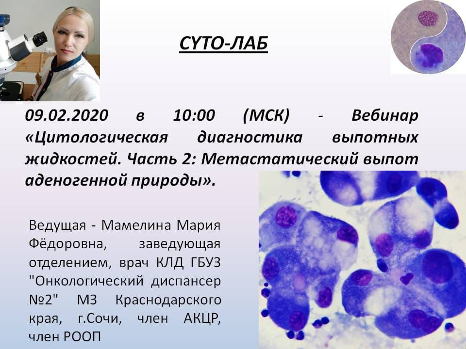 Успешно прошёл вебинар "Цитологическая диагностика выпотных жидкостей" "Часть 3: канцероматоз серозных оболочек" от 24 февраля (понедельник)