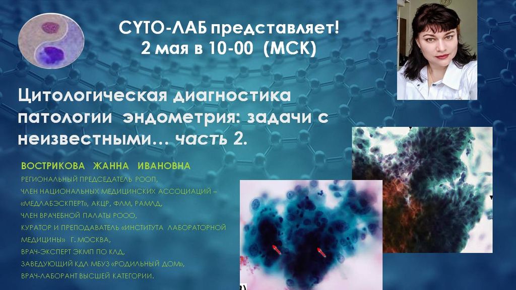 Докладчик: Вострикова Жанна Ивановна, Региональный председатель РООП, Член национальных медицинских ассоциаций – МедЛабЭксперт, АКЦР, ФЛМ, РАМЛД, Член Врачебной Палаты РООО, Куратор и преподаватель «ИЛМ» г. Москва, Врач-эксперт ЭКМП по КЛД, Врач-лаборант Высшей категории.